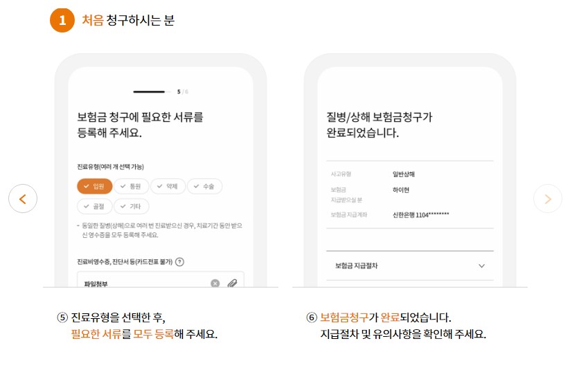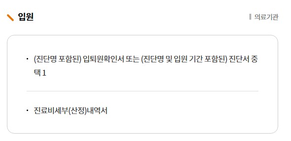 - (진단명이 포함된) 입퇴원확인서 또는 (진단명 및 입원기간 포함된) 진단서 가운데 1가지를 선택해서 제출