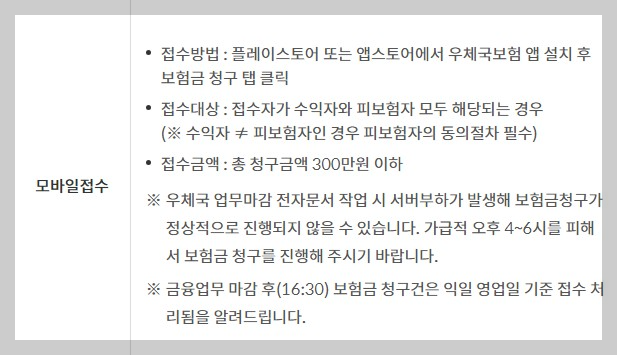 - 접수방법: 우체국 보험 앱을 다운로드 및 설치하고, 보험금 청구로 접수하기