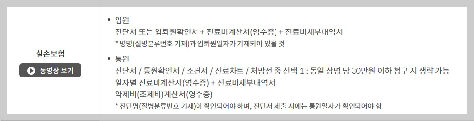 - 진단서, 통원확인서, 소견서, 진료차트, 처방전 가운데 1개 선택해서 제출 (동일 상병당 30만원 이하 청구시 생략할 수 있음)