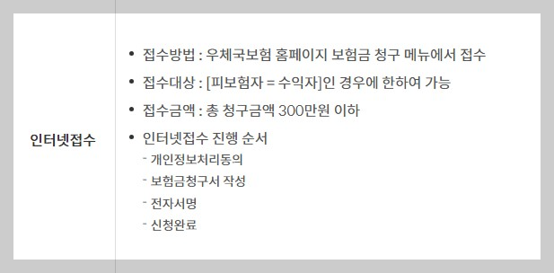 - 접수방법: 우체국보험 홈페이지에 있는 보험금청구 메뉴에서 접수